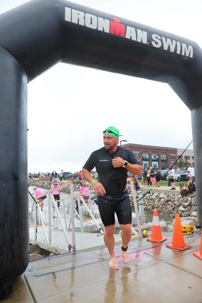 Apparently the water was a little rough in the beginning. I didn’t really notice but I also had an advantage because I swam in Lake Erie for several weeks prior to race day and a few times it was pretty rough when I swam so I was well prepared for the waves. I actually didn’t notice that it was rough until someone pointed it out later. My swim goal was first to finish before the one hour and ten minute cutoff time, second to complete it in an hour or less, ideally to finish in under 55 minutes. I nailed it! 54 minutes, 4 seconds! There are lots of faster swimmer, no doubt, but this was my fastest swim time ever so I was happy with it.